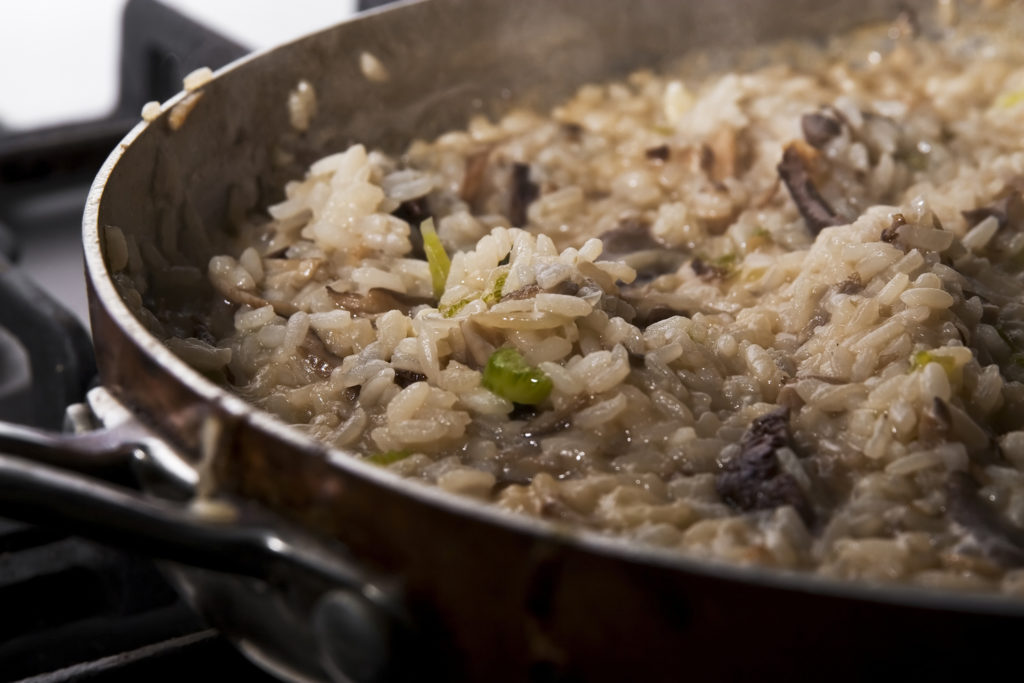 - Add the rice, the mushrooms, the rest of the cream and the mascarpone, and cover with the stock.