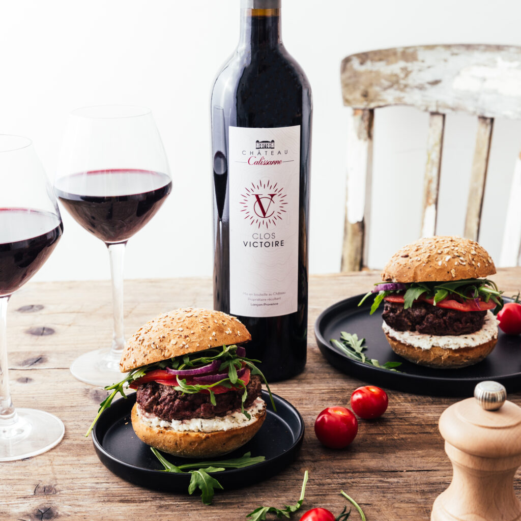 - Lorsque les steaks sont cuits comme il vous convient, montez les burgers. Tartinez le fromage de chèvre aux herbes de Provence sur la moitié des petits pains toastés. Posez les steaks dessus. Puis répartissez les tranches de tomate, les feuilles de roquette et les tranches d’oignon rouge. Placez les deuxièmes moitiés de pains et servez immédiatement.