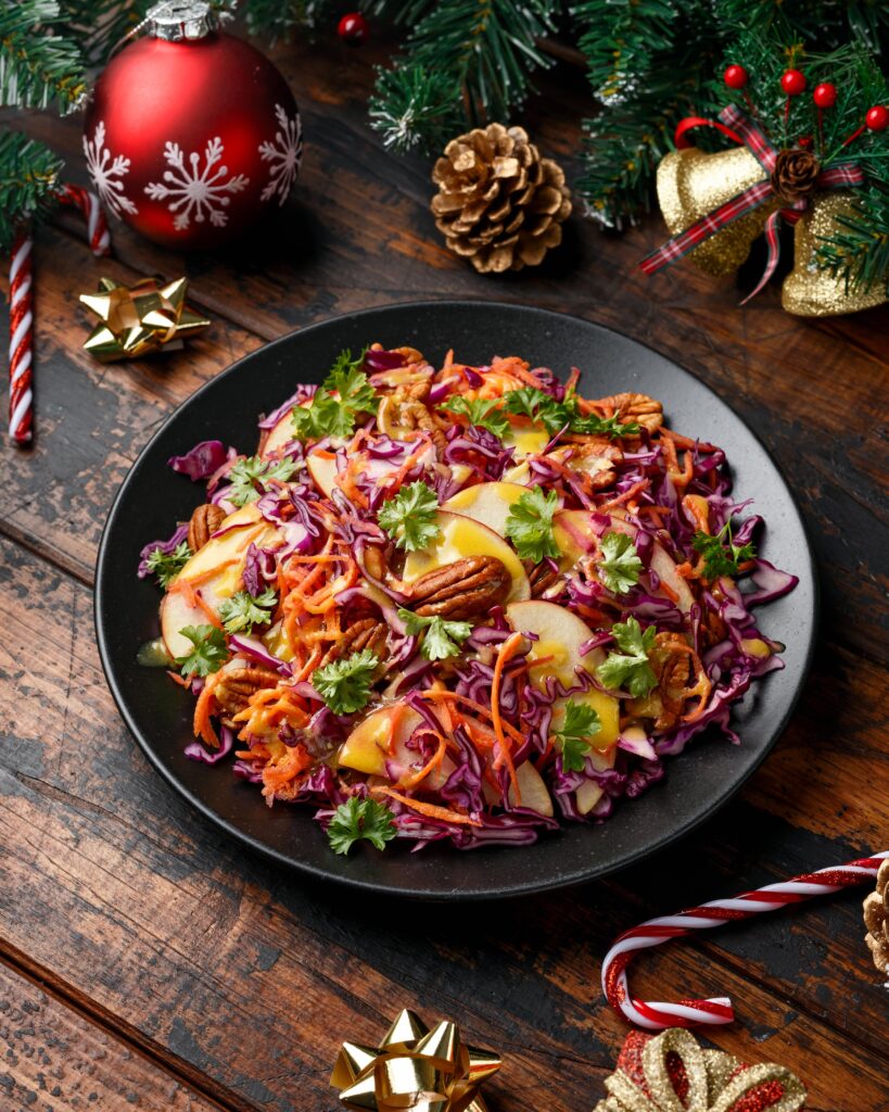 Cette salade festive et colorée est parfaite pour accompagner vos repas de fêtes. Elle allie le croquant du chou rouge, la douceur des carottes et des pommes, et le goût délicat des noix de pécan, le tout relevé d’une vinaigrette légère.